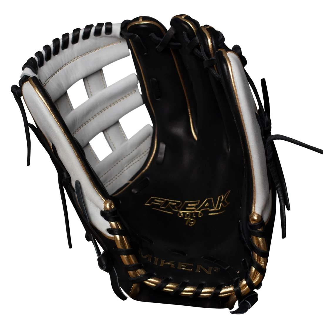 The 15″ Miken Pro Series Slowpitch Softball Glove features a limited edition Black, White, and Gold Colorway. This Freak Gold series is offered in a limited edition number to top dealers nationwide. The Miken Pro Series offers quality full grain leather which provides improved shape and retention.